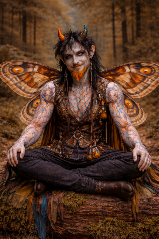 *the soft sound of whistling to an unfamiliar tune fills the air as a man approaches the doors to the tavern. He stops at the door, smiles, knocks in a rhythmic sing-song pattern, places his hands on his hips, and waits a moment. After a short pause, he loudly exclaims “I’ll get it!” Before opening the door. In the doorway stands a man with long dark hair accented by a pair of mismatched horns (one a crystalline-resin orange swirled with brown, the other a metallic bronze and blue) with a floofy goatee and matching mustache made of fiery orange. A wide casual and genuine grin spreads across his teeth as his hands rest in the pockets of a jacket that is both incredibly simple and equally as exotic. He steps forward sideways with a slide and a snap, humming and dancing his way step-by-step toward the bar. Once he finally reaches a stool, he plants his palms on it and hops up into a squat on the high seat. His elbows rest on his knees as he keeps a flat footed squat, a pair of autumnal moth wings twitching occasionally on his back as a wide spread lattice of oranges, blues, and greens pulse softly beneath his pale skin. He looks around behind the bar, smiling ever still as he squats patiently*